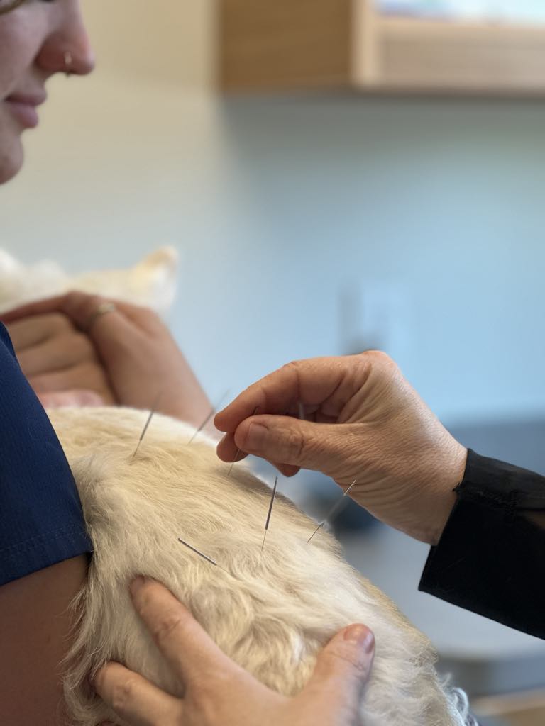 Veterinarian performing acupuncture on a pet Relaxed pet after acupuncture treatment